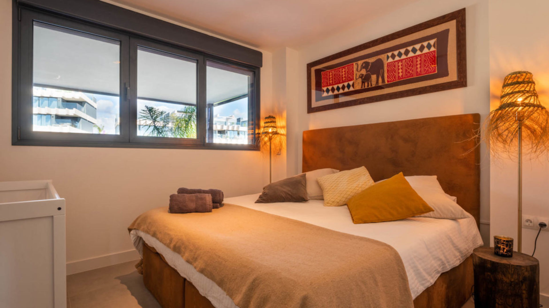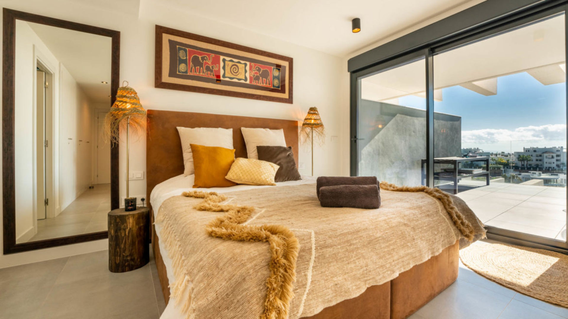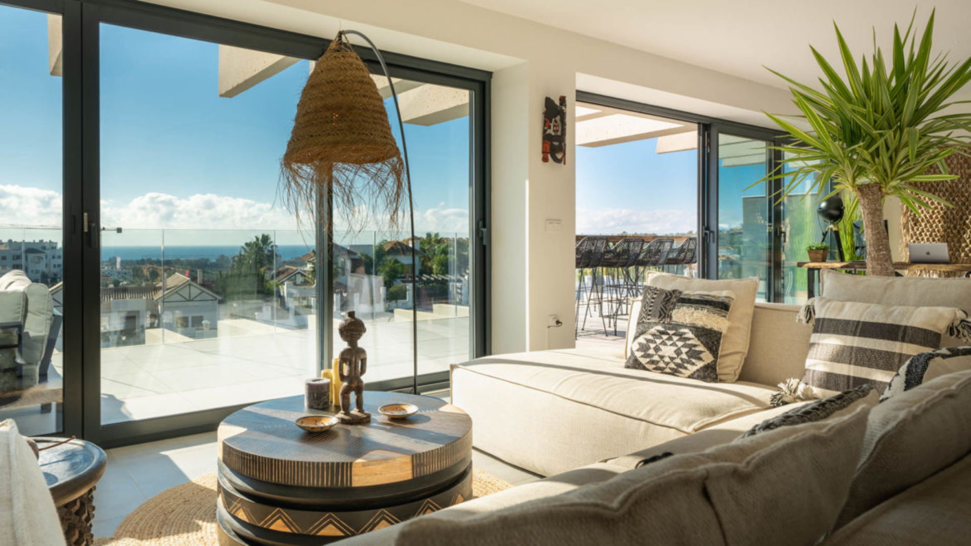 Luxe nieuwbouw appartement met zwembad, gym en spa met 180 graden zeezicht. Geniet in alle rust dit dubbele nieuwbouw appartement in de 'New Golden Mile'. Een Boho, licht Afrikaans getint interieur met een open keuken en woonkamer, die moeiteloos overgaan in een ruim terras (70m2). Perfect om buiten te dineren of te genieten van de zon op de ligbedden.